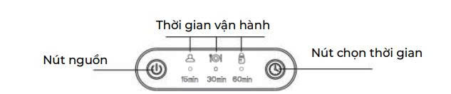 Chọn thời gian làm việc: Thiết bị hoạt động mặc định trong 60 phút. Nếu muốn thay đổi thời gian làm việc, người dùng nhấn nút chọn thời gian (Time Selection Key) để chuyển đổi giữa các mức: 60 phút, 30 phút và 15 phút. Các thời gian này sẽ xoay vòng theo thứ tự sau mỗi lần người dùng nhấn nút. Các mức 15′, 30′, 60′ tương ứng với thời gian cho một chu trình sấy khô và khử trùng.